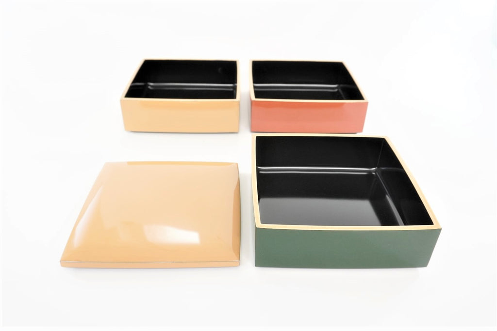 漆だからこそ出来る色合い、漆にしか出来ない風合いと質感を求め、3色の色漆を使用したカラフルな重箱を商品化いたしました。