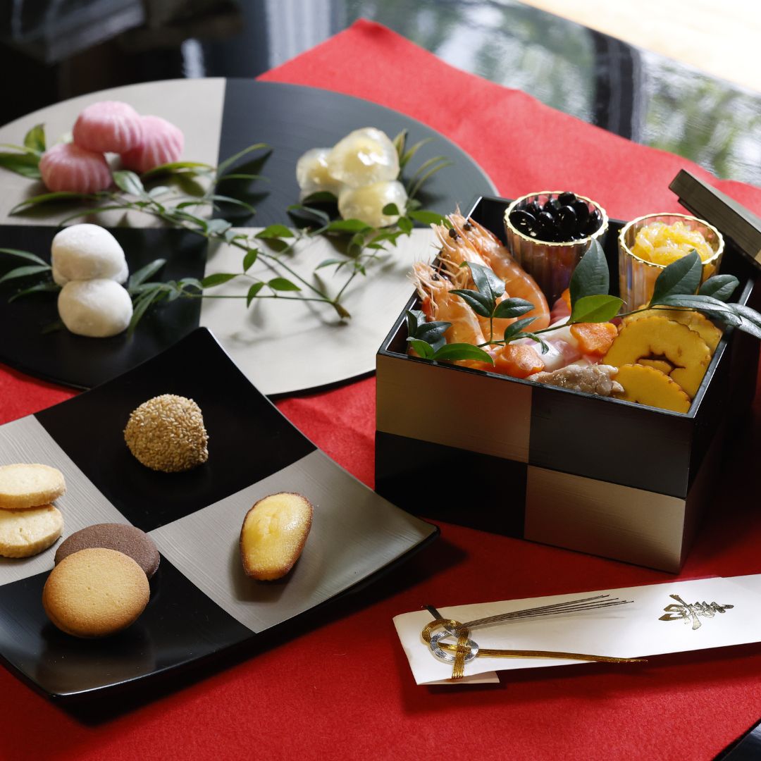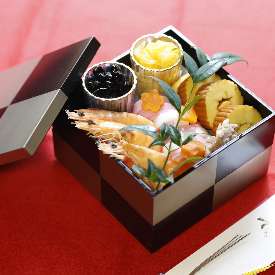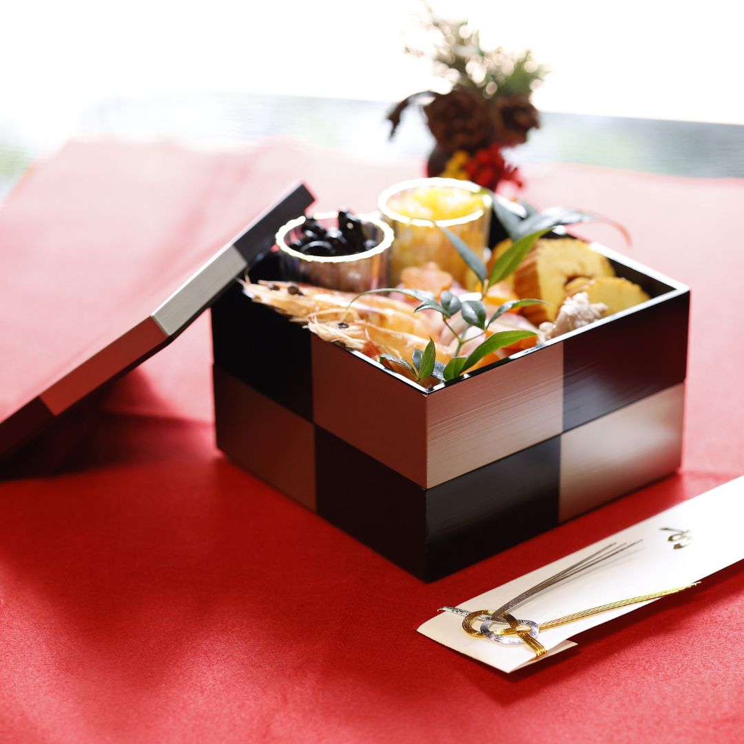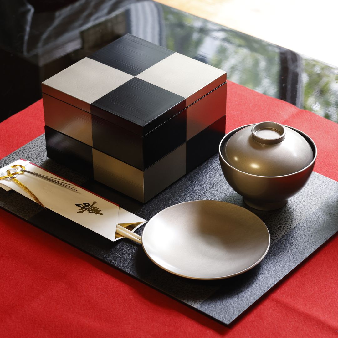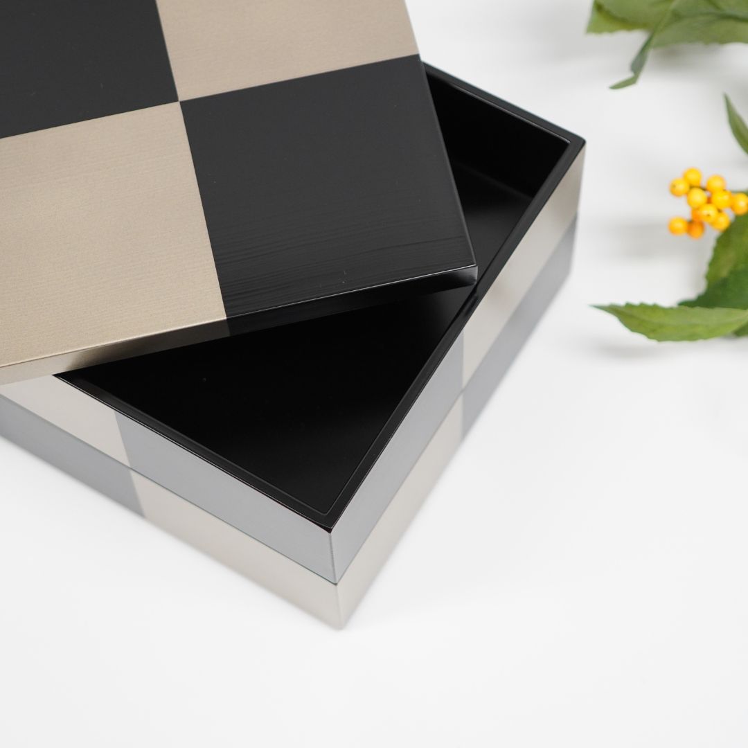 高翆だけのオリジナルデザイン「黒ハケ目 市松模様」の二段重。