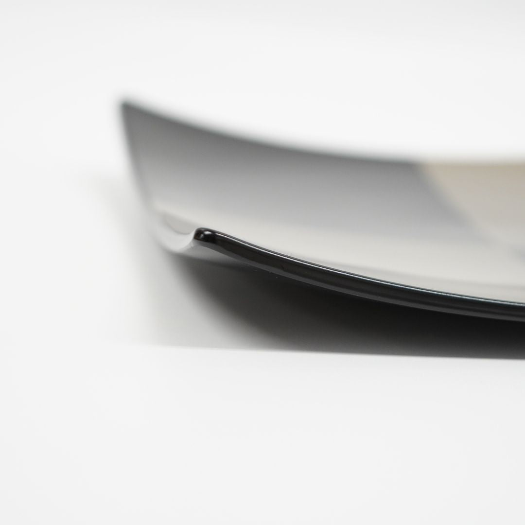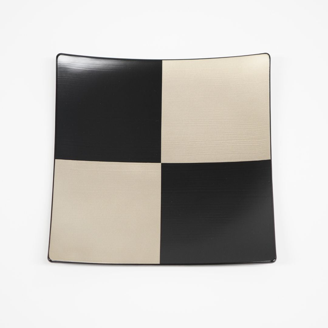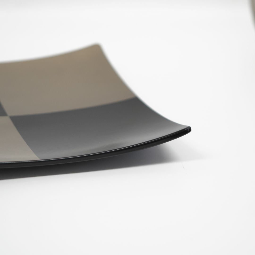 黒漆の深みある艶に、ハケ目の動きと市松模様、そしてさりげなく輝く銀彩を組み合わせた、モダンな佇まいの越前塗の平皿です。