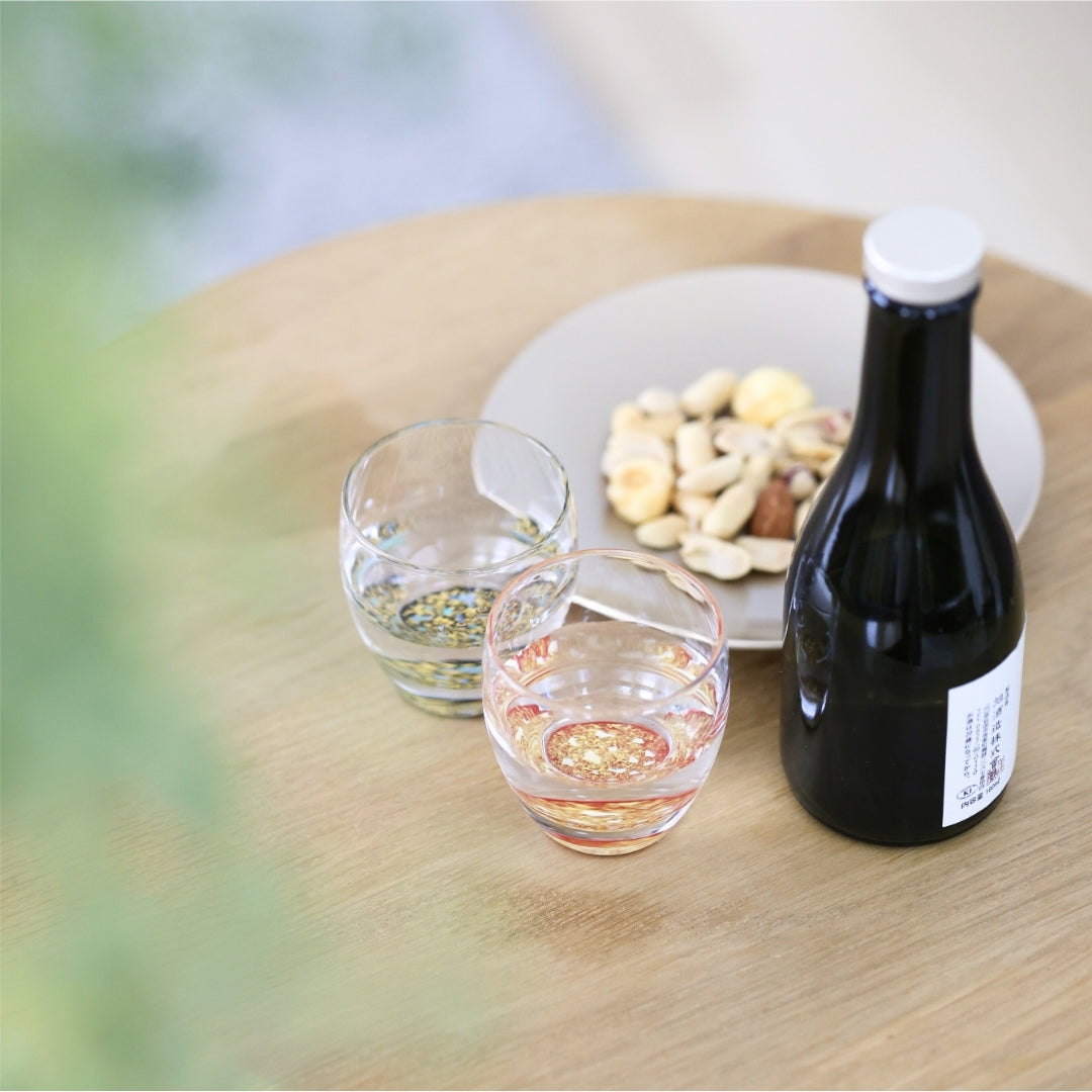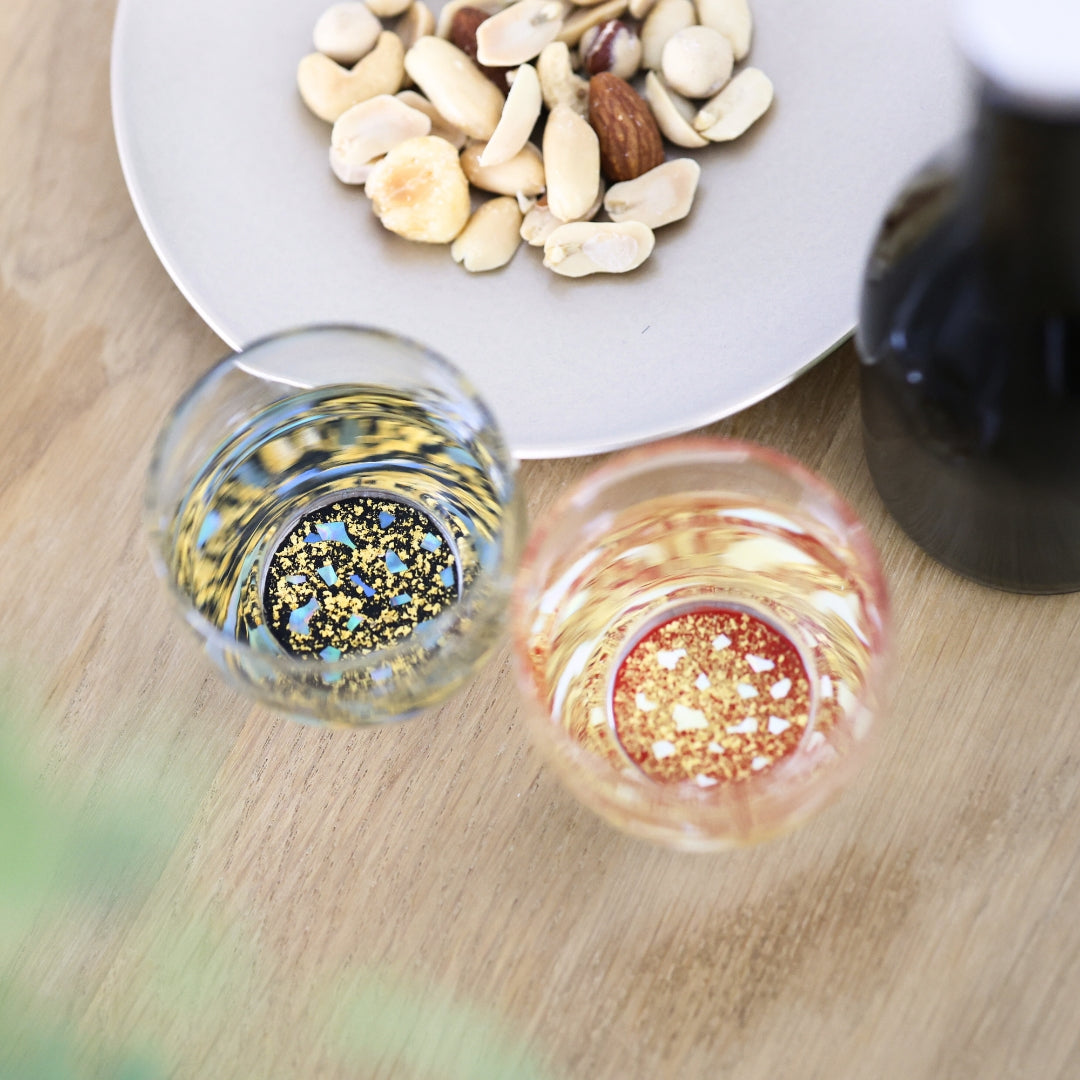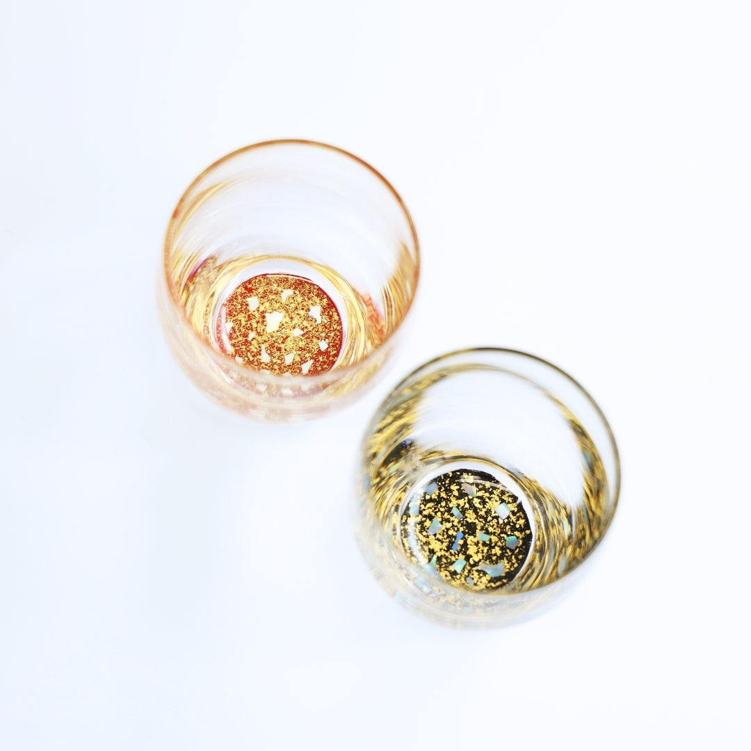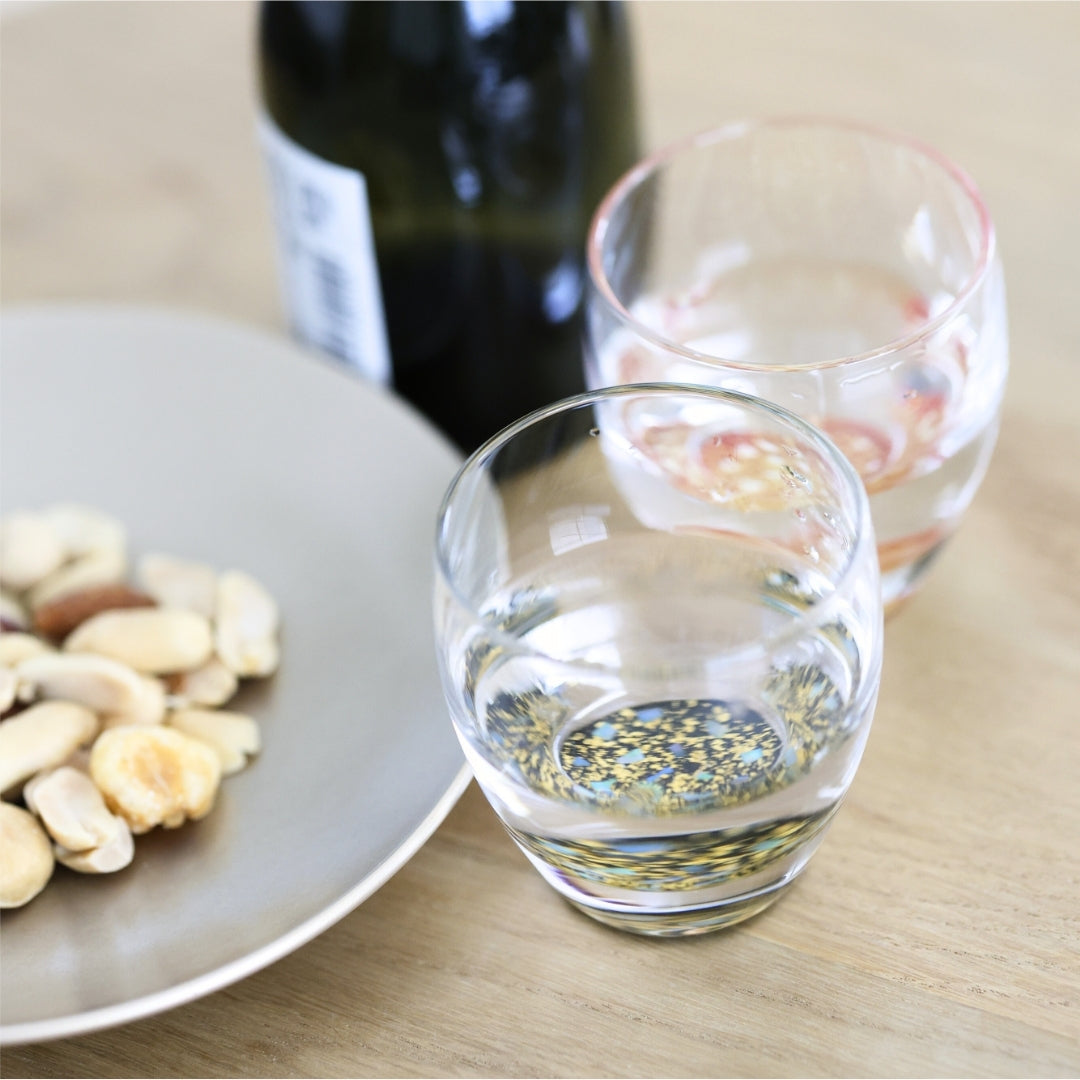 グラスの底面に越前塗の加飾技術を用いて小さな螺鈿を散りばめ、金箔砂子を蒔いた、「銀河シリーズ」の冷酒グラス。