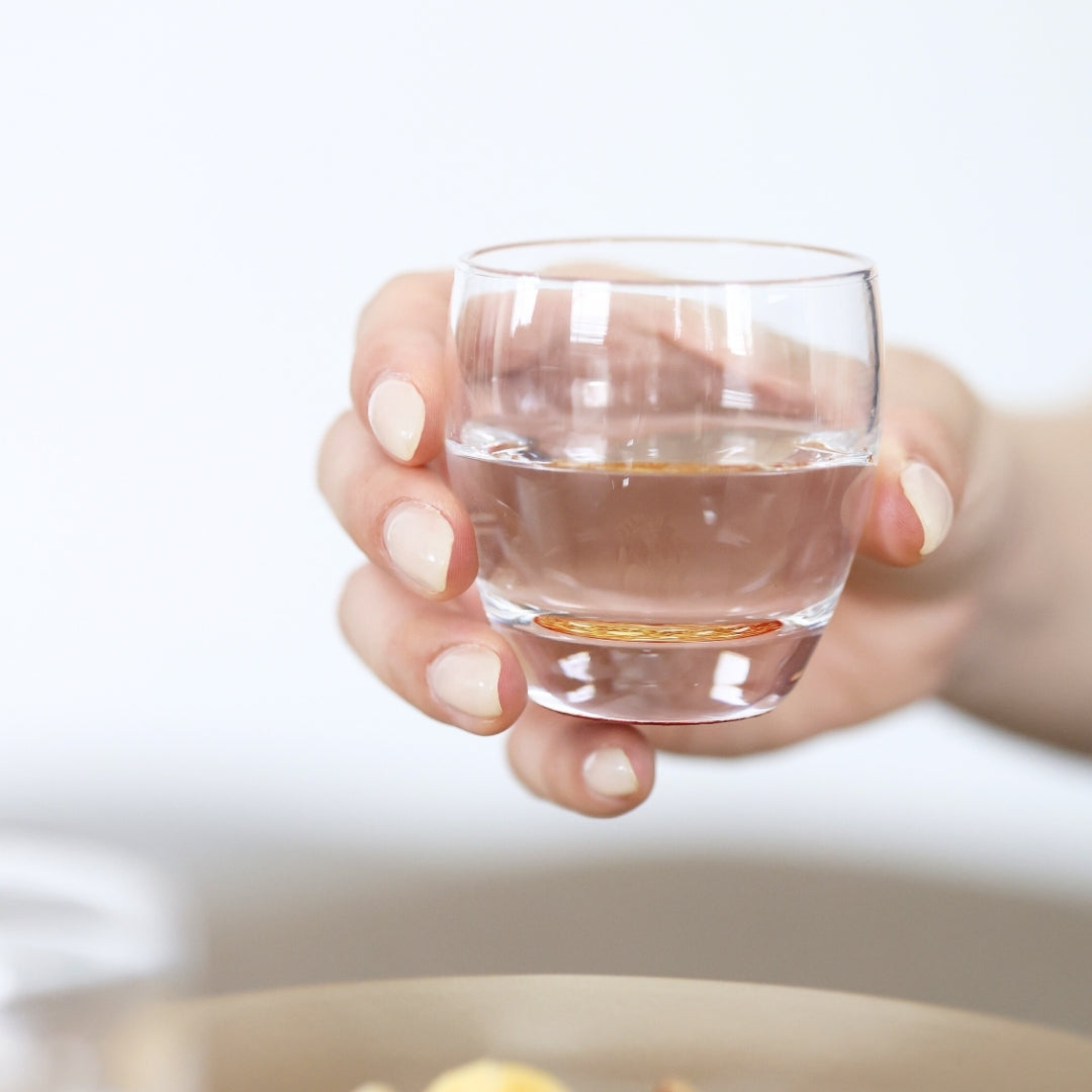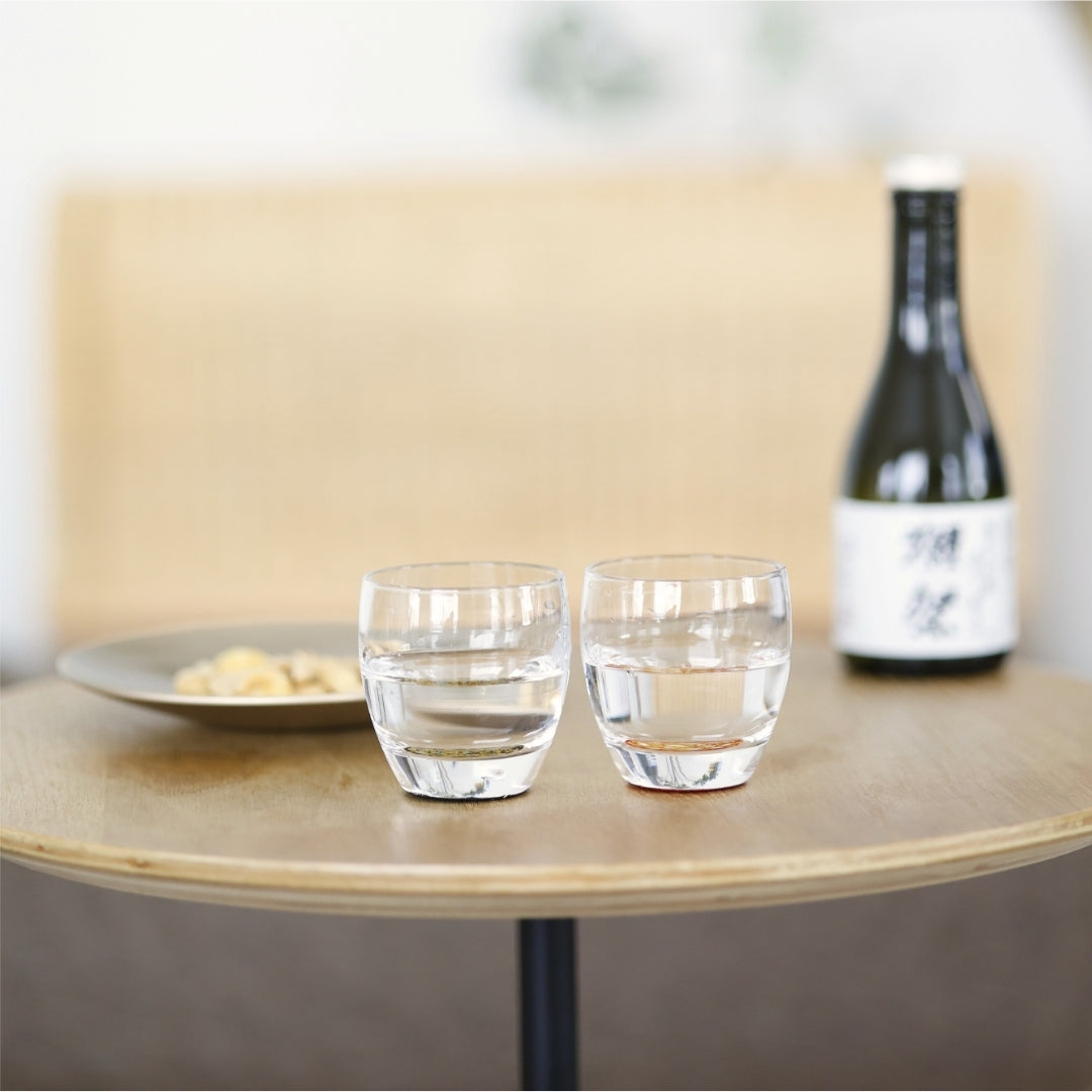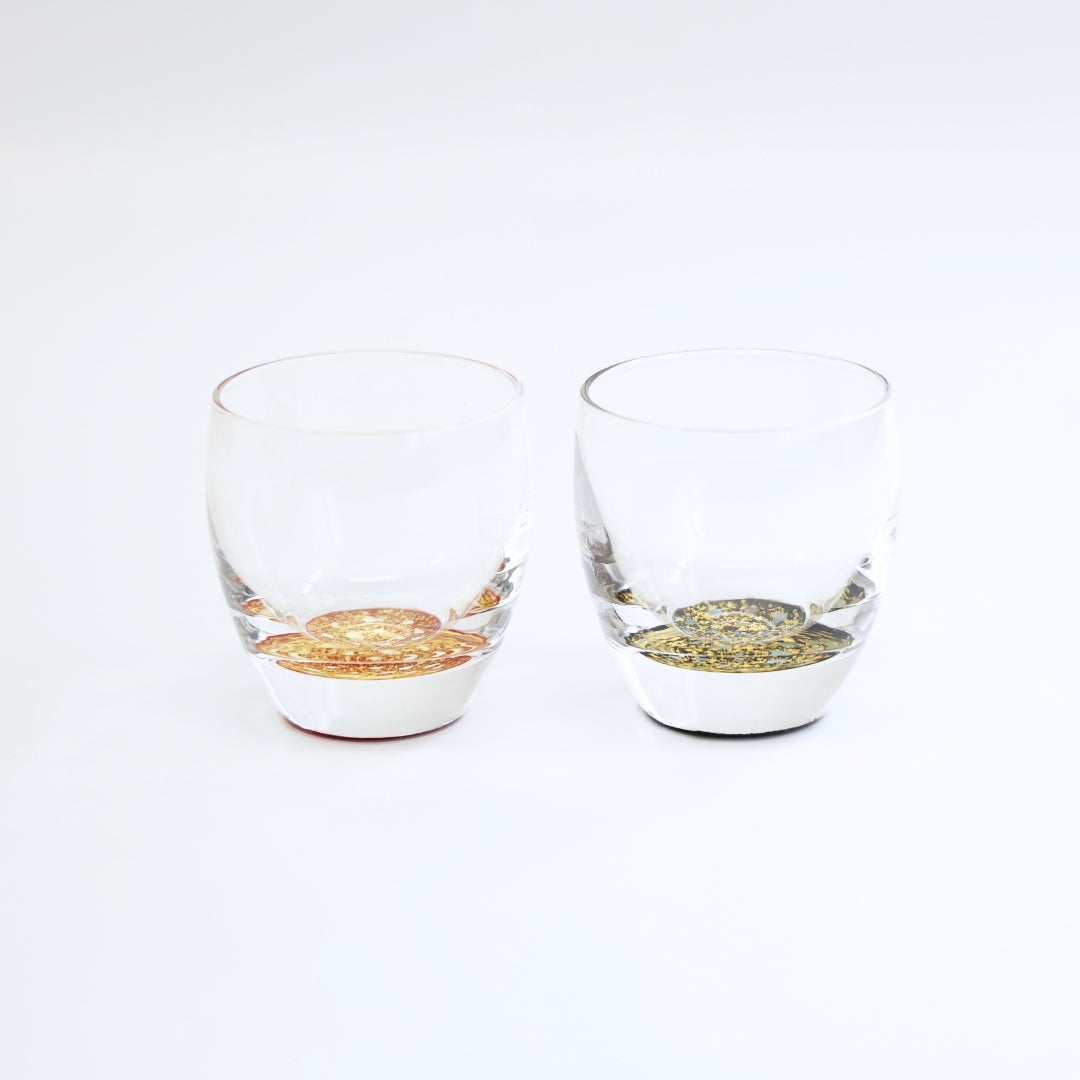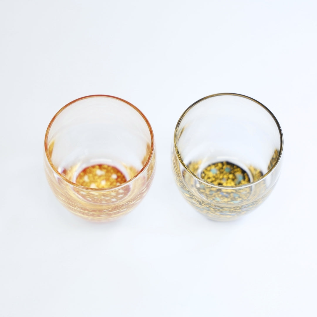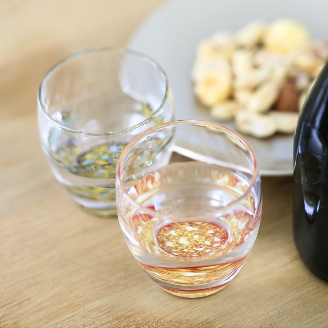 グラスの底面に越前塗の加飾技術を用いて小さな螺鈿を散りばめ、金箔砂子を蒔いた、「銀河シリーズ」の冷酒グラス。