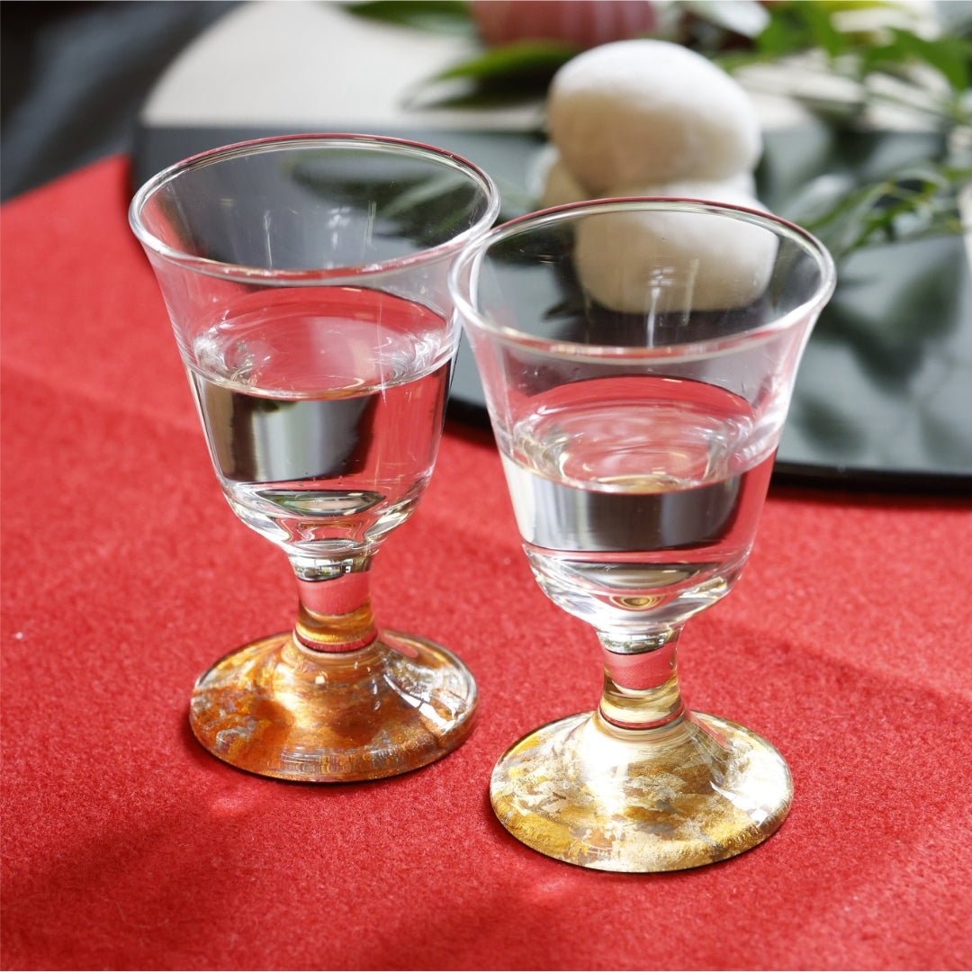 グラスの底面に越前塗の加飾技術を用いて数種類の箔を散りばめた、高翆オリジナル「箔ちらしシリーズ」の高杯グラス。