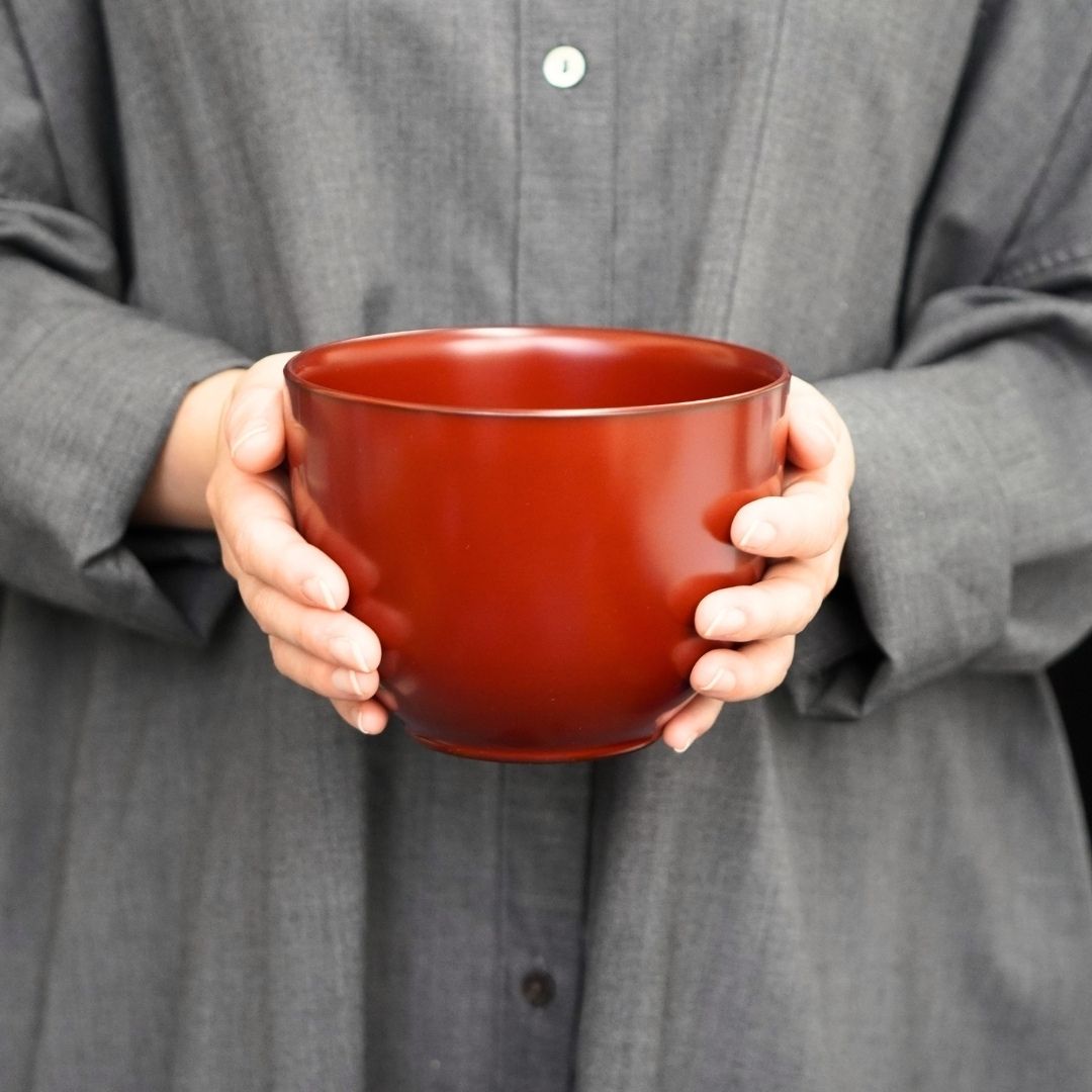 やや黒っぽい赤色で重厚感のある「古代朱」のお椀。落ち着いた色合いの古代朱は、古くから格式の高い色として知られています。